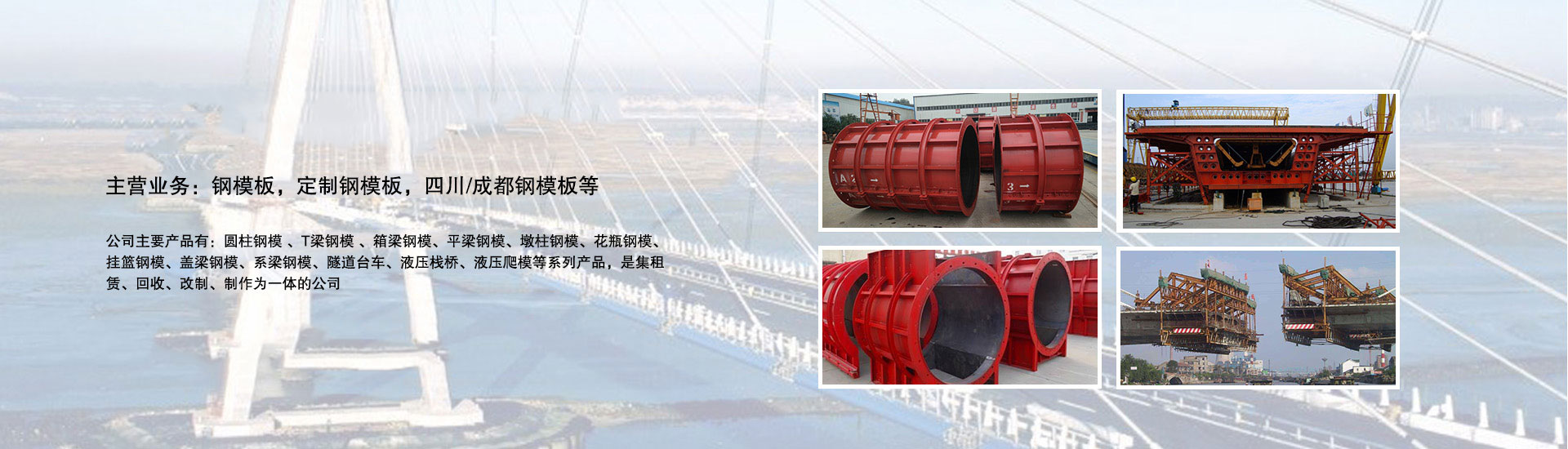 我公司主要產(chǎn)品有:圓柱鋼模 、T梁鋼模 、箱梁鋼模、平梁鋼模、墩柱鋼模、花瓶鋼模、掛籃鋼模、蓋梁鋼模、系梁鋼模、隧道臺(tái)車、液壓棧橋、液壓爬模等系列產(chǎn)品,是集租賃、回收、改制、制作為一體的公司。